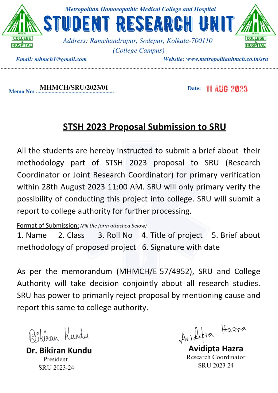 We, the students of Metropolitan Homoeopathic Medical College and Hospital, are delighted to announce the establishment of the Student Research Unit (SRU), a pioneering initiative aimed atfostering a culture of research, innovation, and academic excellence among our students. SRU is a dedicated platform that encourages united work, promotes scientific research, facilitates problem-solving, conducts meetings, hosts annual competitions, organizes seminars related to research and academic, and endeavours to bring forth novel ideas that address contemporary challenges. SRU is an independent unit which will act without any influence of authority, canrepresent college in many official matters.